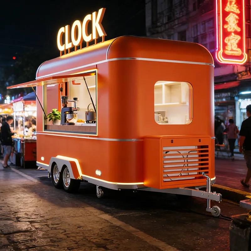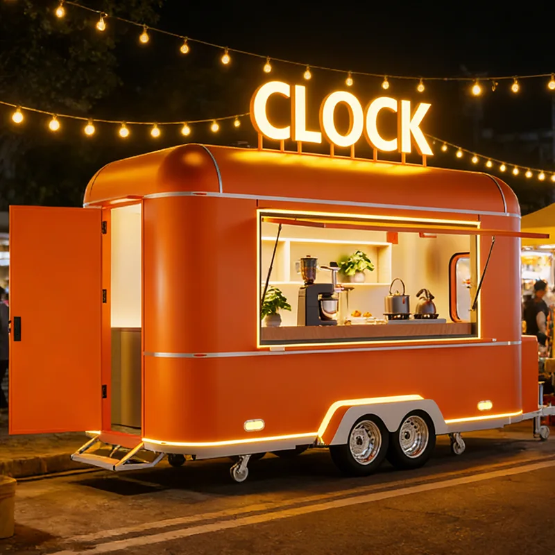 Der Concession Trailer verfügt über einen robusten Stahlkonstruktionsrahmen, der mit einem verstärkten Zugmechanismus und einem hochstabilen Aufhängungssystem ausgestattet ist und problemlos von Pickups und leichten Lastkraftwagen gezogen werden kann. Es passt sich den Straßenverhältnissen an, beispielsweise auf Wegen in malerischen Gegenden, in der Umgebung von Stadien und in Ausstellungsparks. Die Bereitstellung ist effizient und langlebig. Der Hauptkörper besteht aus lebensmittelechter Isolierung und korrosionsbeständigen Verbundplatten, die mit einem umfassenden Rostschutz und einer versiegelten Abdichtung behandelt sind, um Temperaturunterschieden im Freien und schlechtem Wetter standzuhalten. Das Erscheinungsbild unterstützt die individuelle Markenanpassung in allen Dimensionen, kann das System der Franchise-Marke genau reproduzieren und wird mit einem eingebetteten leuchtenden LOGO, einer individuellen Lackierung und einem klappbaren Sonnenschutz kombiniert, um die Markenbekanntheit zu verbessern und die konsistente Darstellung des Markenimages zu unterstützen. Der Innenraum besteht vollständig aus Edelstahl 304 mit rutschfesten und ölbeständigen Arbeitsplatten, Wänden und Böden, die leicht zu reinigen sind und die Compliance-Anforderungen von Franchise-Betrieben vollständig erfüllen.